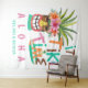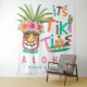 Tapeçaria de fundo com tema Tiki tropical apresenta um totém Tiki pintado à mão, abacaxi, prancha de surf e papagaio com tipografia "É Hora do Tiki". A saudação "aloha" e os nomes (ou qualquer texto que você goste que caiba naquele espaço!) podem ser personalizados. Perfeito para recepção de casamento, chá de casal, luau, aniversário, aniversário de casamento e qualquer celebração com tema insular. Arte por KL Stock