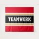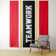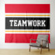 Este esportivo, design atlético, apresenta TRABALHO EM EQUIPE de texto ousado dentro a uma faixa preta destacada com faixas duplas de corrida branca e amarela contra faixas brilhantes de fundo vermelho. O texto neste design pode ser personalizado.