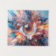Uma representação vibrante e surreal foca-se num olho muito detalhado cercado por uma explosão de elementos abstrato e coloridos. A composição apresenta uma mistura de penas, formas orgânicas e rajadas de cor que irradiam para fora, criando uma cena dinâmica e cativante. Digital Art Photoshop CS5