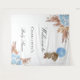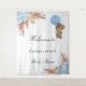 Uma tapeçaria de boas-vindas para um chá de bebê elegante e moderno. Um fundo branco decorado com capim dos pampas em estilo boho, flores em rosa dourado e azul claro e um ursinho menino segurando um balão. Personalize e adicione um nome.