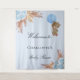 Uma tapeçaria de boas-vindas para um chá de bebê elegante e moderno. Um fundo azul claro decorado com grama pampas em estilo boho, flores rosa dourado e azul claro e um ursinho menino segurando um balão. Personalize e adicione um nome.