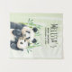 Tapeçaria de chá de bebê com uma ilustração fofa em aquarela apresentando uma mamãe e um ursinho panda preto e branco se aconchegando juntos. A mamãe está segurando seu filhote entre alguns talos de bambu verde.