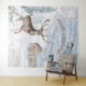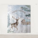 Veado de Natal em madeira de neve, com uma cabana de madeira e árvores cobertas de neve. Ilustração manual de aquarelas modernas. O texto de Feliz Natal é personalizável e opcional.