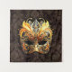 A decorative masquerade mask features intricate designs in gold and black, embellished with ornate damask patterns and vibrant yellow feathers. The mask exudes an elegant and luxurious vibe, suitable for a grand celebration or ball. Venetian Mask