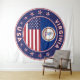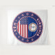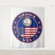 Crachá do Estado da Virgínia com bandeira da Virgínia e bandeira dos EUA, cores, forma arredondada. Emblema da Virgínia. Selo da Virgínia. Coleção dos Estados Unidos.
