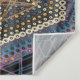 Um hexágono recheado com um padrão de pequenos círculos, cada um contendo um ponto, disposto numa estrutura semelhante a um pente de mel. No hexágono, há um padrão estelar formado por múltiplos triângulos sobrepostos. Várias formas geométricas, incluindo círculos, triângulos e cubos, desenhadas em cores como rosa, azul e laranja.