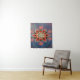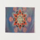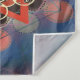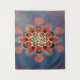 Forma de oito pontas vermelha, sobreposta com intrincados padrões circulares brancos que se assemelham a anéis ou olhos interconectados. Várias formas geométricas, incluindo círculos, triângulos e hexágonos, dispostas de forma simétrica e repetitiva. Um gradiente de cores, principalmente roxas e azuis, com padrões circulares adicionais e linhas pontilhadas que acrescentam profundidade e dimensão à peça.