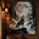 A powerful wolf stands majestically on a rocky outcrop, howling at an enormous full moon rising above a misty pine forest. This dramatic black and white tapestry features flowing ink wash techniques with detailed fur texture, atmospheric fog, and silhouetted evergreen trees. The monochrome composition captures the mystical connection between wolf and moon, with layered mountains fading into the ethereal background creating a deeply spiritual, wild scene.Perfect gift for wolf enthusiasts, wildlife photographers, nature lovers, hikers, and anyone drawn to the untamed spirit of the wilderness. This atmospheric tapestry brings the raw power and mystery of the wild into any space. Ideal for cabin decor, rustic home aesthetic, dark academia style, adventure-themed rooms, offices, or as a meaningful present for camping enthusiasts, outdoor adventurers, and wildlife admirers. The moody atmosphere and flowing ink textures create a contemplative, inspirational ambiance perfect for bedrooms, living rooms, or meditation spaces.