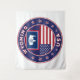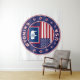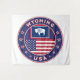 Crachá de Wyoming com bandeira de Wyoming e bandeira de cores dos EUA, forma arredondada; design Patriótico. Verifique toda a coleção de todos os Estados Americanos. Wyoming, coleção dos Estados Unidos. Emblema do poster de Wyoming.