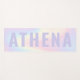 Um tapete de yoga com um plano de fundo do arco-íris pastel macio e seu nome em roxo claro.