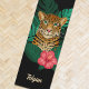 Este estonteante tapete de ioga apresenta um leopardo desenhado/pintado pela mão, com folhas tropicais da selva e uma flor de hibisco rosa brilhante sobre um fundo de cor personalizado (mostrado em preto). Um modelo de texto é incluído para facilitar a personalização. Moderno, bonito e colorido - faz um presente excelente! *Trabalho de arte / Ilustração de Tracey Khalei / Impressões Orabella