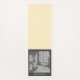 The yoga mat features a calm, sand-like design in warm beige and natural tones, reminiscent of fine beach or desert sand. A subtle artistic illustration is printed: a young woman sitting cross-legged in a classic yoga pose.