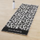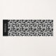 Beautiful personalized farm yoga mat with a pattern of black cow spots over a white background. Illustrated and designed by Patricia Alvarez.