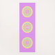 "Fashion Eco Frily Yoga Mat" com três círculos pastéis multicoloridos sobre fundo violeta. Círculos de cor múltipla central têm o texto OM. O texto OM pode ser personalizado.