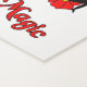 Uma silhueta negra sobre uma flor vermelha com a palavra mágica em vermelho, preto e amarelo