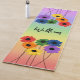 YOGA MAT Flores arco-íris, cada uma com uma das cores da bandeira arco-íris LGBTQ+ / PRIDE, em longos e finos caules pretos sobre fundo macio do arco-íris, com seu nome no centro. Fundo do arco-íris suave nas costas.