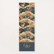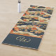 This retro look serving yoga mat features a Japanese style print -- similar to patterns from kimonos -- with white, teal, tan, and orange on dark teal-- almost black. Swirls of stylized clouds interplay with beautiful cheery flowers, mixed in with subtle stripes and other geometrical elements. Your initial monogram appears in gold text on a coordinated color block of dark blue teal, bordered by orange, at the bottom of the mat.