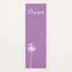 Um dandelion branco brilhante com sementes sopradoras e a palavra, Dream, escrita em um roteiro de rico decora este tapete de ioga em fundo de lavanda, fazer perfeito para se esticar na sua próxima classe.