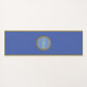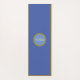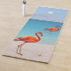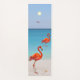 Lindos flamingos na praia com o sol ascensão Yoga Mat. O verso é azul-oceano sólido com a palavra yoga.