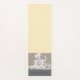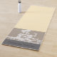 The yoga mat features a calm, sand-like design in warm beige and natural tones, reminiscent of fine beach or desert sand. A subtle artistic illustration is printed: a young woman sitting cross-legged in a classic yoga pose. Insert your name at the bottom of the mat.