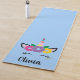 É um belo tapete de ioga unicórnio arco-íris em cor azul-clara. Você pode personalizar facilmente seu nome nele. O presente perfeito para alguém é para a malhação e fazer yoga e exercícios.