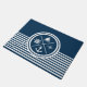 Design náutica com símbolos náuticos (âncora, barco à vela, roda à vela, bússola) decoração em fundo listrado branco e azul marinho.