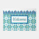Porta de boas-vindas com padrão de azulejo. Esta porta apresenta um design geométrico de repetição original em azul marinho e turquesa em branco. Este sotaque caseiro encantador pode funcionar em uma cabana ou uma fuga costeira. Este design é baseado em um design de azulejo repetitivo do azulejo de Oregon Fay Jones Day.