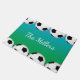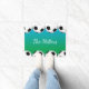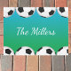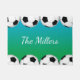 A bola de futebol borda em um fundo azul e verde com seu nome familiar personalizado, monograma ou outro texto no meio, faça uma porta divertida para uma família amorosa de futebol.