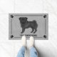 A ilustração original do desenho de Destei de um cão da raça Pug, casaco preto, bonitinho. O cachorro está parado e olhando em direção ao espectador. A cauda está enrolada no topo das costas do cão. A boca do cão está fechada e a cor do olho é castanha. A cor de fundo é cinza com textura decorativa. A textura pode ser removida e a cor de fundo pode ser alterada para qualquer outra cor, se desejado. O design é enquadrado por uma fronteira na moda. Há uma silhueta de impressão de pata de cachorro em cada esquina também. Sob a imagem do cão há um texto personalizável que é para um nome de família ou outro texto personalizado, como "bem-vindo", por exemplo.