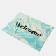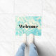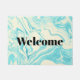 Um tapete na moda e sofisticado de boas-vindas com um elegante padrão de mármore faux com cores giratórias em azul turquesa e cores creme. Bem-vindo escrito em uma fonte grande e ousada.