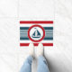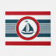Design náutica com decoração em forma redonda de embarcações à vela, em fundo listrado, a azul, vermelho e branco