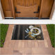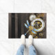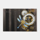 Marcadores antigos com engrenagens de ouro e latão, decorados com libélula mecânica sobre fundo castanho listrado. Steampunk.