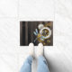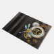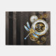 Marcações antigas com engrenagens de ouro e latão, decoradas com libélula mecânica sobre fundo castanho e listrado. Steampunk.