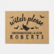 Doormat clássico e elegante do Dia das Bruxas para a queda - da "bruxa texto por favor" com bastões, uma bruxa do vôo, e seu nome de família