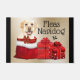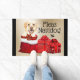 Uma ilustração adorável com aquarela de um cão labrador amarelo sentado num saco de Papais noeis vermelhos vibrantes revestido de pelo falso e um arco vermelho vítreo aparado de ouro falso tem dois presentes maravilhosamente envoltos em branco e vermelho ao lado dele e as palavras, pulgas navidog, acima dele. O design bonito é enquadrado por um fundo dourado falso que tem duas bordas pretas verticais. Ideal para amantes do Yorkshire e acessórios da casa de Natal nesta época festiva.