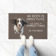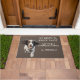 "Não precisamos bater duas vezes, temos um Springer Spaniel" diz este tapete de porta giro. O texto está em branco no lado direito, enquanto uma foto de um adorável Springer Spaniel está à esquerda. Tudo é colocado sobre um fundo castanho.