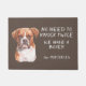 "Não precisamos bater duas vezes, temos um Boxer" diz este tapete de porta giro. O texto está branco no lado direito, enquanto a imagem de um Cachorro-Boxer marrom e branco está à esquerda. Tudo é colocado sobre um fundo castanho de cinza.