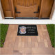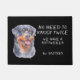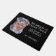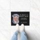 "Não é preciso bater duas vezes, temos um Rottweiler" declara este tapete engraçado da porta. O texto encontra-se em cinzas prateadas do lado direito, enquanto a imagem de um rottie preto e bronzeado está à esquerda. Tudo é colocado sobre um fundo preto.