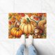 Dois esquilos estão cercados por abóboras e folhas coloridas do outono. A cena é vibrante com uma atmosfera lúdica e quente.