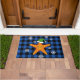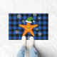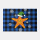 Uma ilustração de um bonito desenho animado, o peixe-estrela laranja kawaii, vestindo um chapéu de santa verde rodeado de flocos de neve para o Natal em um padrão de búfalo preto e azul. Essa vida marinha em um design de controle é uma ideia de presente para amantes do Natal, amantes do Papai Noel e amantes do oceano.