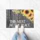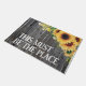 Este deve ser o tapete da porta do girassol com um fundo de padrão de madeira escura. Bem-vinda a casa doce.