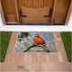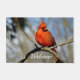 O cardeal vermelho animador envia um cumprimento bem-vindo, no doormat resistente.