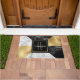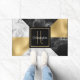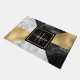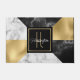 A atitude moderna de uma Arte Deco inspirou um tapete de porta, feito em um padrão geométrico de folha de cor dourada, mármore branco e mármore preto. Um quadrado preto e dourado, no meio, tem um monograma de letras solteiros amarelas ouros e texto branco pronto para personalizar. Adorável decoração doméstica e faz uma ideia de presente de excelente.