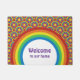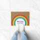 Torne a sua porta mais clara com este tapete fácil de personalizar que apresenta um design gráfico de estilo retro de ranhura inspirado nos anos 70 com discos sobrepostos num arco-íris de cores centrados num sol com raios ligeiramente torcidos.