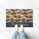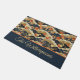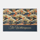 Esta mat de aparência vintage apresenta um impressão do estilo kimono japonês com branco, cor de rosa, castanho e cor de laranja na face escura - quase preto. Seu nome monograma aparece em texto dourado em um bloco de cor coordenado de palha escura, bordado por laranja. Você também poderia usar outro texto, como "Bem-vindo" ou uma frase abreviada, se preferir.