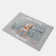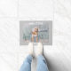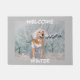 Este tapete de porta apresenta um recuperador de ouro vestido como uma fada de inverno sentada na neve e segurando uma varinha soletrando no inverno. O texto diz: "WELCOME WINTER".