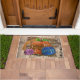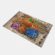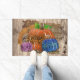 Fall leopard print pumpkins in blue, purple, orange and rose pink set on textured Autumn brown plaid background.
