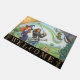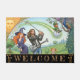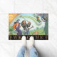 Bem-vinda porta para a casa de Golf / Golfistas apresentando uma feliz família moderna com uma mãe de bruxas, pai de estrelas de rock, garotinha e mágica do estilo Art Nouveau com pavão e duende voando na bola de golfe. Um tapete de casa divertido para qualquer ocasião. Personalize facilmente o texto "bem-vindo".