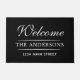 Porta personalizada moderna e elegante. Este Design apresenta um texto branco "Bem-vindo" em um script de caligrafia escrevendo com o sobrenome da família, o endereço de rua da sua casa e os sotaques simples de linha de divisor horizontal.