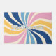 With a retro twist, personalize your doormat with a 70s inspired, colorful sunburst. The family name or other custom text is in layers, with the top layer being outlined text. The sunburst features pink, creme, yellow, light blue, and blue colors.